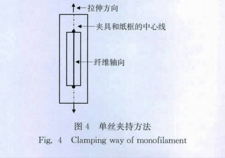 夹持试样时,试样与夹具不要有偏离,先固定上夹具,位置正确后再固定下夹具。夹具不要碰到,更不要夹到纤维与纸框的粘结点处,以免损伤纤维,如图4所示,要保证单丝轴向、夹具和纸框的中心线和拉伸方向重合。