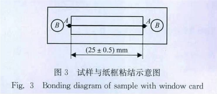 用有一定强度的纸,如坐标纸,刻出如图3所示的纸框,纸框的间距为(25±0.5)mm,其宽度与总长度根据拉力机夹持器的尺寸来定,并保证用镊子夹取时纸框不发生变形。图3中A为纤维与纸框粘结处,B为拉力机夹持处。