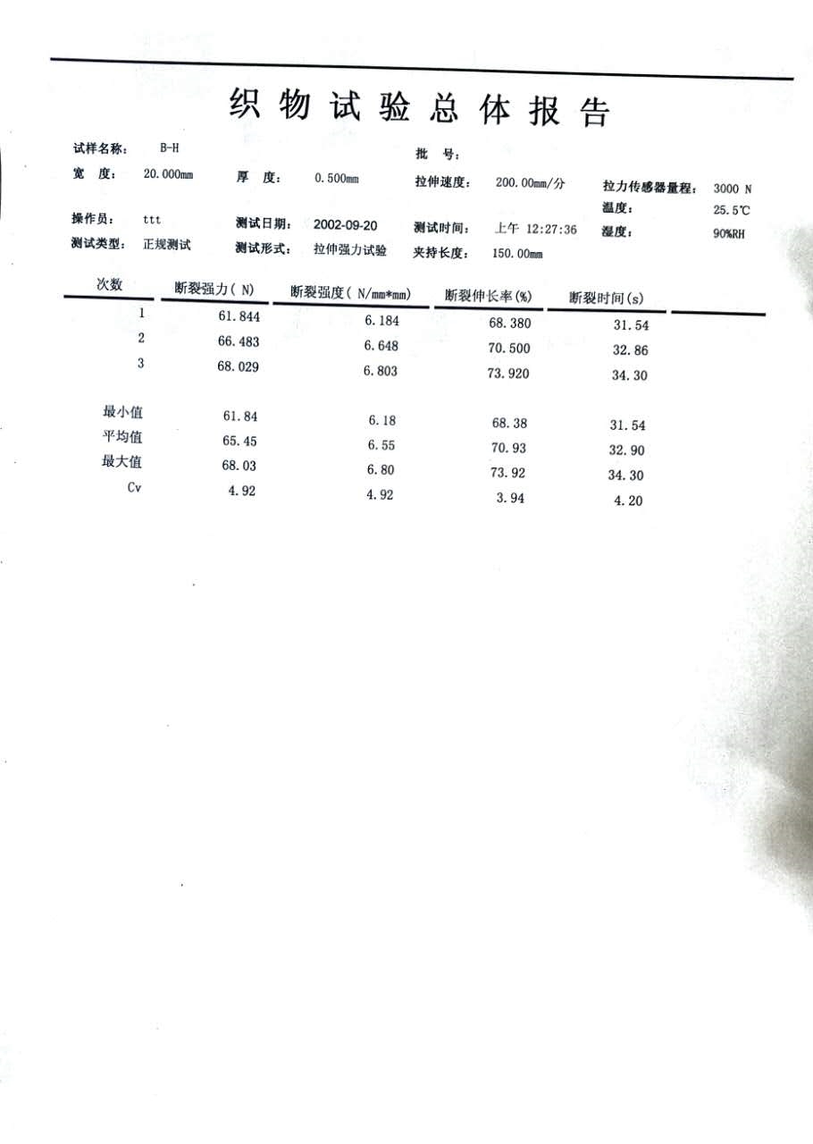 三、打开测量软件,软件上设定好200mm/min的速度后,夹持器会以200mm/min的速度做等速运动,至无纺布被拉断后,仪器记录无纺布样品的断裂强力,断裂伸长率,断裂时间,断裂强度等指标。可以在程序上设定好每次要做的次数,此次试验我们给用户做三次,三次做完后程序上会自动计算这三次的^大值,^小值和平均值(断裂强力,断裂伸长率,断裂强度,断裂时间)。下图是横向无纺布样品的测试报告,测试的机型为YG026B型织物强力机,拉力传感器量程为3000N。
