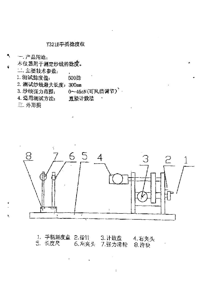 2,先将右夹头4钳口转至水平,此时手柄计数指针2指零,然后将纱线试样夹在右夹头,再将纱线引至左夹头6旁张力座7上。