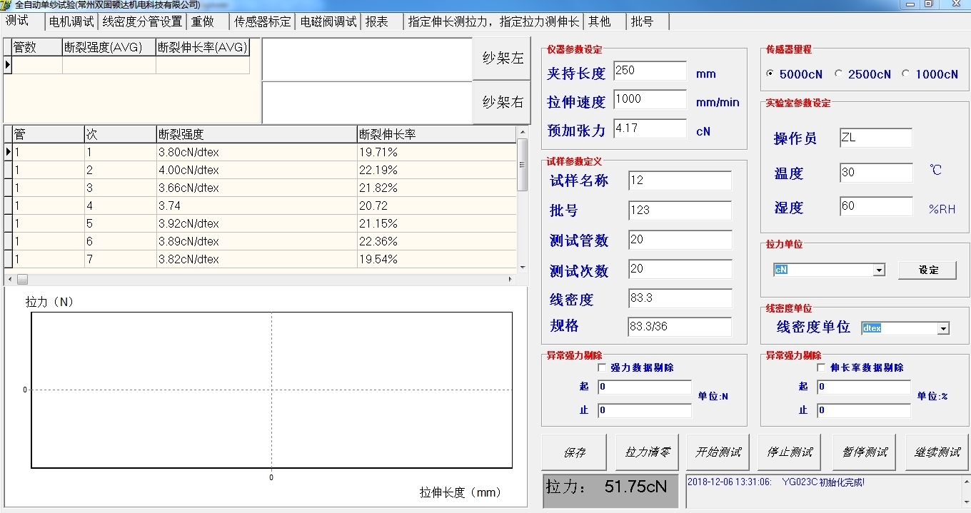 4、预加张力采用自动加载,由试样线密度(纤度)与预加张力系数乘积数而定。