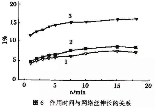 图6中的曲线1、2、3分别表示在图3所示的1、2、3种经纱张力条件下所织造织物中的网络丝在恒定张力作用下随时间变化的伸长率。其中恒定张力按静态交络强度测定法[2]取15mN/d。由图可知,随着t1的增加,其中曲线1、2的变化趋势比较缓慢,且伸长值也较少,这是因为织造完毕后交络结已基本解体的缘故。曲线3随着t1的增加变化较大,伸长值也较大,这是因为织造完毕后长丝中还有较多残留交络结,在张力的作用下逐渐解体使伸长率增加的缘故。这表明织造完毕后长丝中的残留交络结对织物尺寸的稳定性有一定的影响。综上所述,网络丝在织造的开口、打纬等过程中,受到综丝、钢筘等机件的摩擦、拉伸、曲屈的作用,使交络结解体,织造终了时网络结完全解体的条件是张力差和作用时间达到一定值以上。本研究条件下的值为1.15mN/d和13.4min。