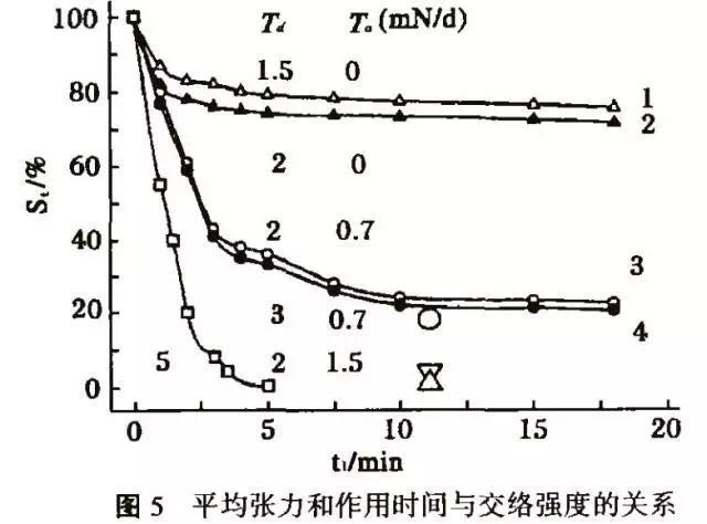 由曲线5还可知,当张力差Ta=1.5mN/d时,随着t1的增加,动态交络强度St迅速减少,当t1=5min时,St已降为0,即网络结已在张力的作用下完全解体。其张力差和作用时间的值显示了网络结完全解体所必须具备的条件。