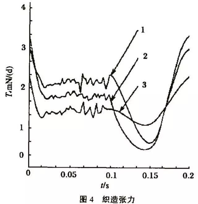 所用GD761-150型喷水织机的车速300r/min,对上述的试料进行织造,通过设备调节改变其织造张力。将张力传感器安装于喷水织机的后梁与综丝之间,在织造中测试张力,并将测试数据输人计算机。图4为实测的三种织造张力,其中1、2、3的^大张力分别为3.1mN/d、3.3mN/d、2.3mN/d,^小张力分别是0.8.1mN/d、0.6mN/d、1.2mN/d,平均张力分别是1.95mN/d、1.95mN/d、1.75mN/d,张力差分别是1.15mN/d、1.35mN/d、0.55mN/d。很显然^大张力发生在打纬时,^小张力出现在综平时。以经纱从织轴上退绕出来为受力开始时间,经纱被织成布为受力终了时间,实测得经纱受力时间为13.4min。