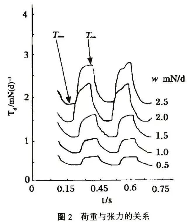 图2和图3为实验时张力仪所测得的张力曲线如。其中图2是屈曲角σ不变,重物ω不同时的张力。图3是重物ω不变,屈曲角σ不同时的张力。其中如图2所示定义^大张力Tmax、^小张力Tmin,平均 T=(Tmax+Tmin)/2,张力差Tɑ=(Tmax-Tmin)/2。由图可知,平均张力与重物ω的数值非常相近,由于ω是静态张力,所以可以认为平均张力代表了张力的静态组分。同时若张力差为0,则张力曲线为一条直线,即动态张力变成静态张力,因此认为张力差代表张力的动态组分。由两图还可知,通过改变ω和σ的值可以调节赋予纱线张力的^大和^小张力,从而满足实验所需的张力要求。