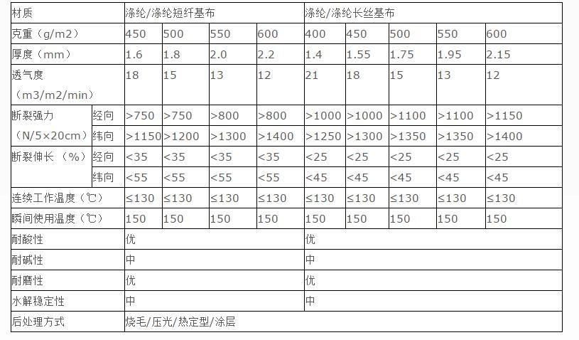 涤纶优质细旦大化纤维丝,以先进设备生产涤纶(聚酯)纤维针刺过滤毡,可将多种纤维均匀定量混合,再用多台混开棉机组及梳理机组利于纤网之间不同纤维间层装复合、梯度变换。该产品除具有普通毡类滤布特有的空隙度高、透气性好、集尘效率高、使用寿命长等优点外,因其耐温等级适中,瞬间可达150℃,耐酸、耐碱适中的特点外而且具有非常好的耐磨性,故它是毡类滤材中使用量大的一个品种。