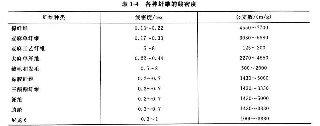 各种纤维的线密度指标见表1-4。