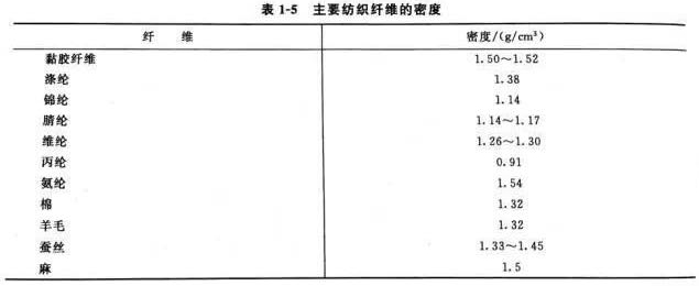 二、纤维的密度(densities)是指单位体积纤维的质量,单位为g/cm³。各种纤维的密度是不同的,在主要化学纤维品种中,丙纶的密度^小,黏胶纤维的密度^大,主要纺织纤维的密度见表1-5。