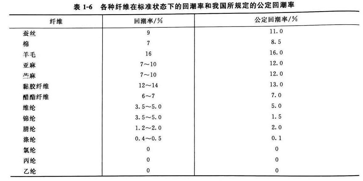 由表1-6可见,天然纤维和再生纤维的回潮率较高,合成纤维的回潮率较低,其中丙纶、氯纶和乙纶的回潮率为零。