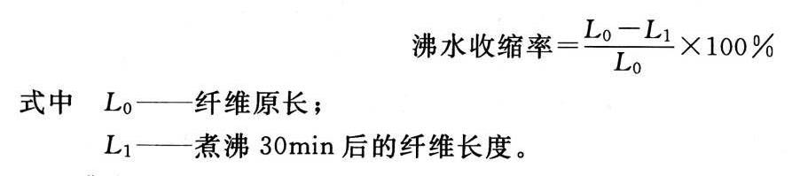 八、沸水收缩率将纤维放在沸水中煮沸30min后,其收缩后的长度与原来长度之比,称沸水收缩率。沸水收缩率是反映纤维热定型程度和尺寸稳定性的指标。沸水收缩率越小,纤维的结构稳定性越好,纤维在加工和服用过程中遇到湿热处理(如染色、洗涤等)时,尺寸越稳定,不易变形;同时物理力学性能和染色性能也好。纤维的沸水收缩率只要由纤维的热定型工艺条件来控制。