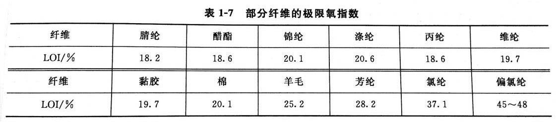 LOI与纤维分类如下。① 可燃性或易燃性纤维 LOI<21%的纤维② 难燃性或阻燃性纤维 LOI>21%的纤维③ 阻燃纤维 LOI>26%的纤维