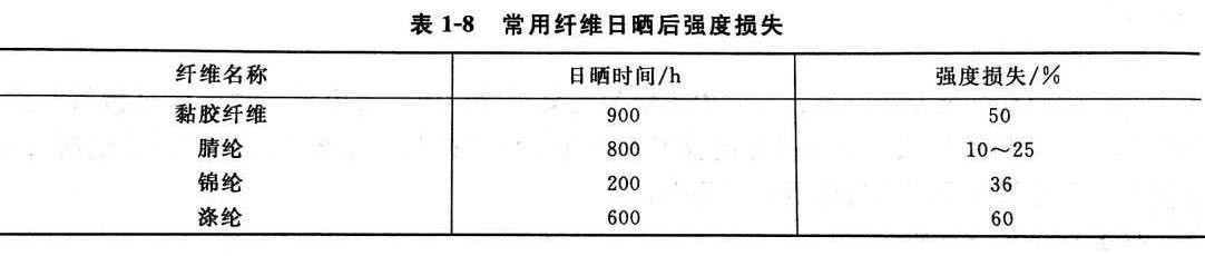 气候条件引起纤维性能的变化,主要是由于日光和空气中的氧引起的,因此提高纤维的耐光性对大气作用的稳定性能是提高其光稳定性和氧稳定性。常用纤维日晒后强度损失见表1-8。