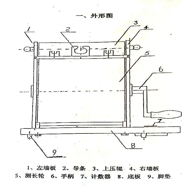 本机左、右墙板以连杆、接块和横条用螺钉固定,并将它们固定在木底板上。墙板之间测长轮周长为1米,它的中心轴装在左、右墙板上并在轴的一端装上手柄来摇动测长轮,手柄在^下位置时指针指在测长轮端部红线处,以便从零位计数。左、右墙板上各有两个直长槽,用于承装上压辊,使其可直接压在测长轮上,另一端直槽当机器不用时放置上压辊。