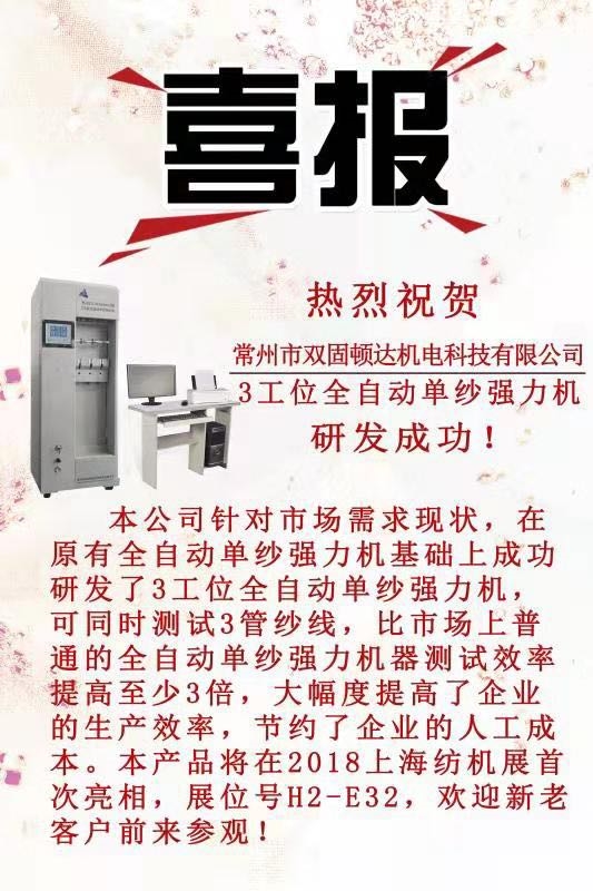 在2018年中国国际纺织机械展览会暨ITMA亚洲展览会开展前夕,常州市双固顿达机电科技有限公司成功研制3工位全自动单纱强力机(YG023C-3channel型3工位全自动单纱强力机),该设备是在原有YG023C型全自动单纱强力机的基础上改进而成,可以同时夹持3管纱线,暨一次可以进行3管纱线的同时夹纱、同时拉伸,比市场上普通的全自动单纱强力机效率至少提高3倍,大幅度提高了企业的生产效率,节约了企业的人工成本。设备每工位可以同时挂8管纱,3个工位最多可以挂24管纱,每次测试设备三管一拉,单管测试完成自动切换到下一管,整个操作过程和原有全自动单纱强力机相似!该设备外观重新设计,采用白色烤漆,颜色光亮润泽;该设备保留了常州双固公司YG023C-III型全自动单纱强力机的液晶触摸屏设计,既可以直接在液晶触摸屏上操作,又可以直接连电脑软件操作,自动化水平又上升了一个台阶;传动部分使用滚珠丝杆,定位精度更高,该设备并将在2018年10月15日到10月19日在国家会展中心(上海)H2-E32展厅现场展览,欢迎广大新老客户前来参观!