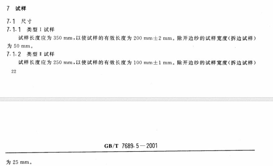 第二种试样长度为250mm,试样有效长度为100mm,除开边纱的试样宽度应为25mm。