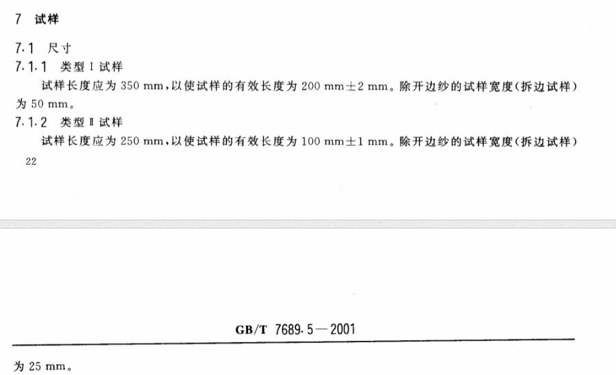 第二种试样长度为250mm,试样有效长度为100mm,除开边纱的试样宽度应为25mm。