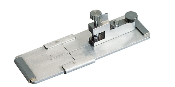 切片器结构如右图所示。切片器由左右两块1.6mm厚的底板组成切片器底板,左右底板上有宽为0.8mm的嵌样槽,它与左底板上的塞片配合将试样推紧。在试样上方有匀给刀,调节匀给螺钉,可控制试样伸出底板的厚度。用刀片在底板部下方切得试样薄片。