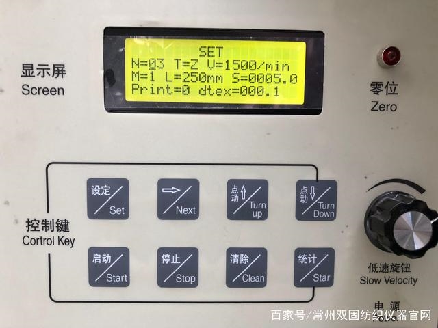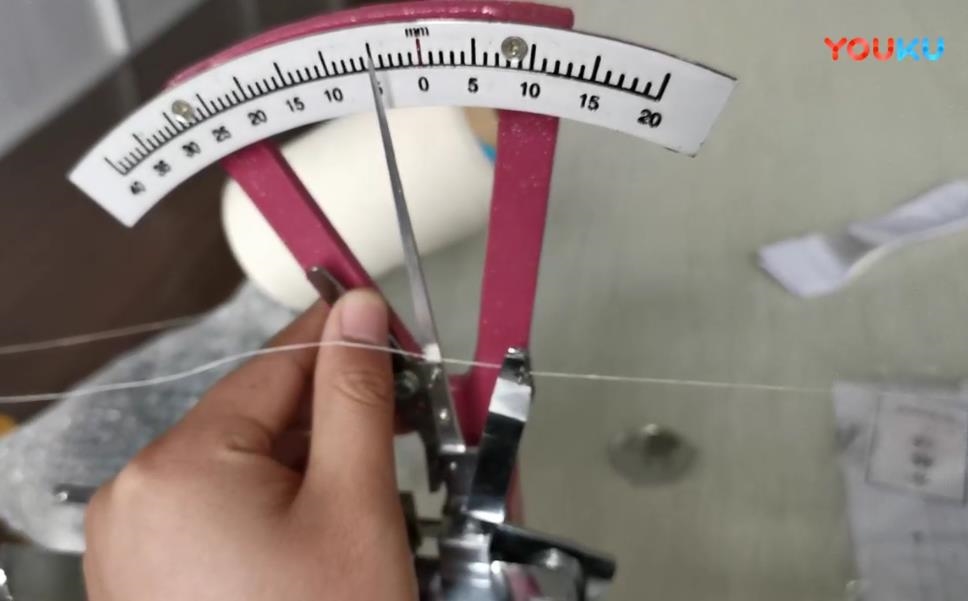 步骤四:按下仪器启动按钮,纱线会先退捻,标尺指针会到达预先设置的允许伸长4mm处,退捻后会开始加捻,标尺指针会回到0处,这时候仪器零位灯亮起,试验结束,测试完毕,在液晶屏幕上读取每10cm捻度的数值(亦可换算没每米捻度),再多次重复测试,得到其平均值。