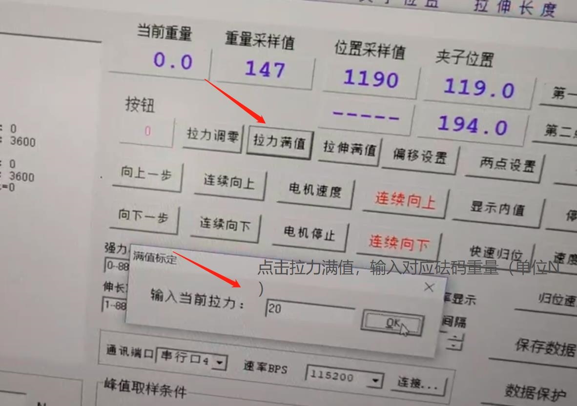第四步:点击拉力调零,在上夹具处挂上砝码,保证砝码静止不动,然后看一下“当前重量”处的值,如果不是,再点击上图中的“拉力满值”输入砝码对应重量值(N)即可。