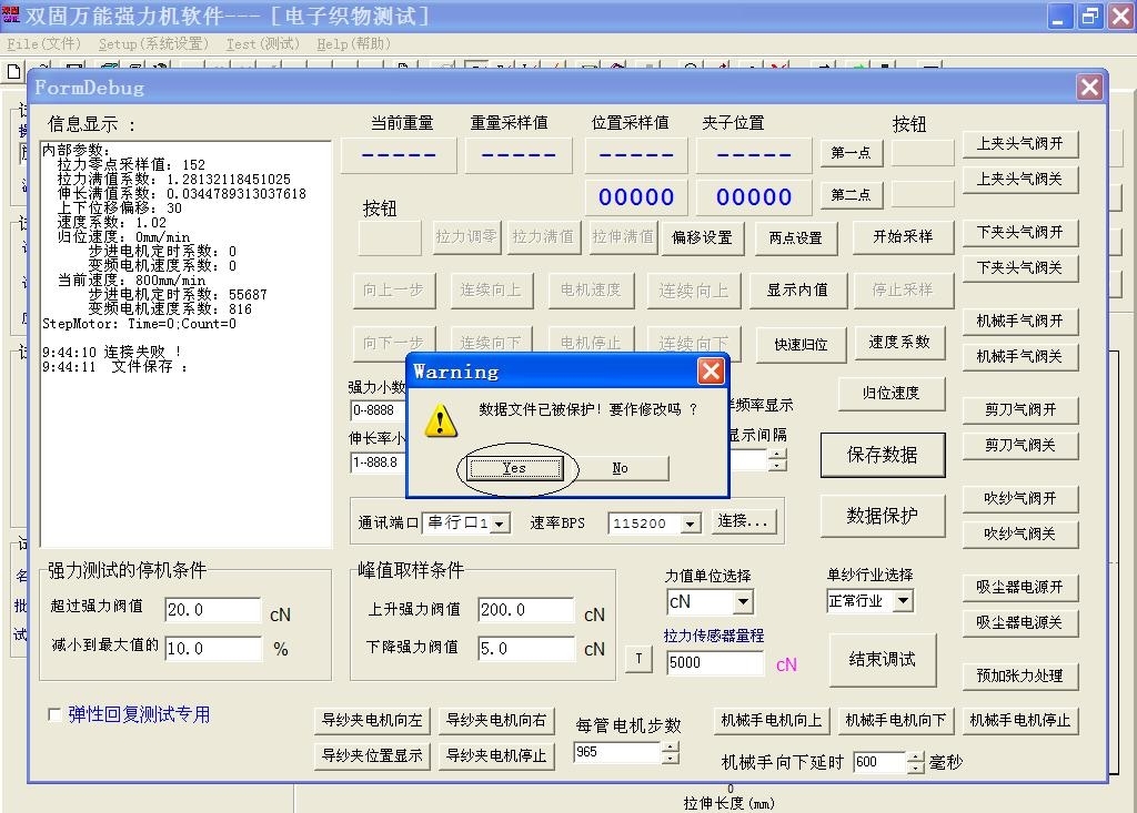 第六步:点击“ YES”按钮,然后再点击“数据保护”,至此YG026B型电子织物强力机强力校准已经完成。