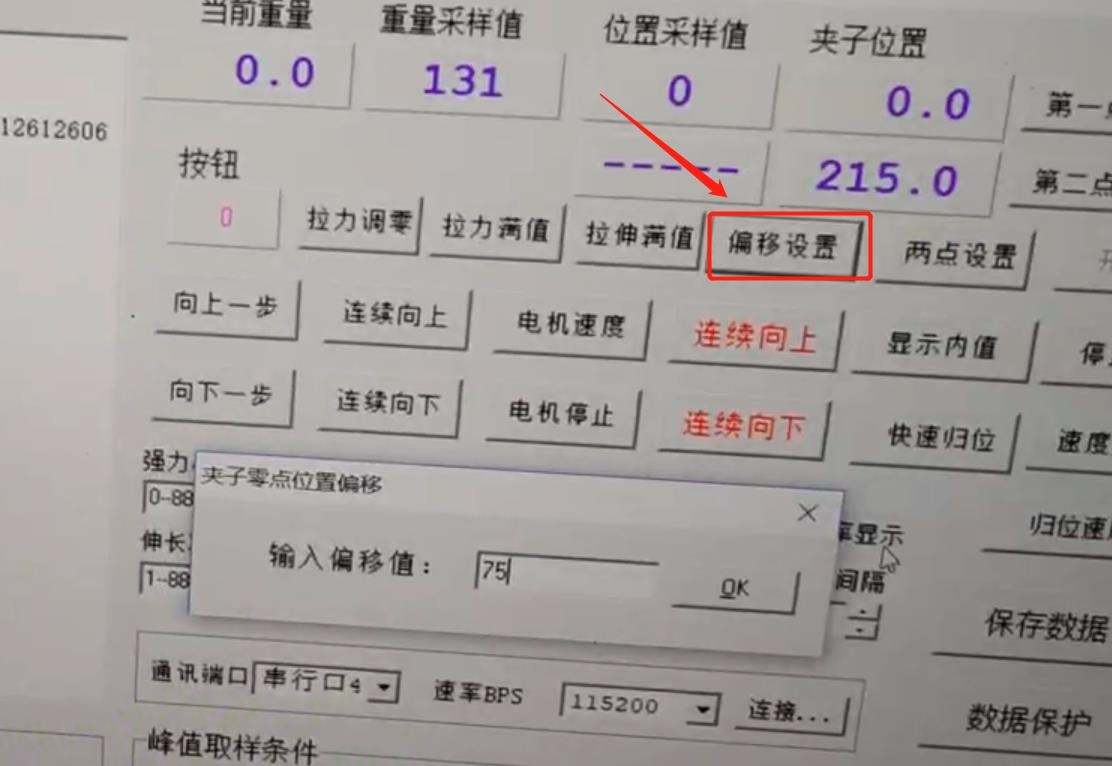 第三步:点击开始采样,出现重量采样值和位置采样值后,点击偏移设置,将刚才量的上下夹具距离L1用键盘输入进去。