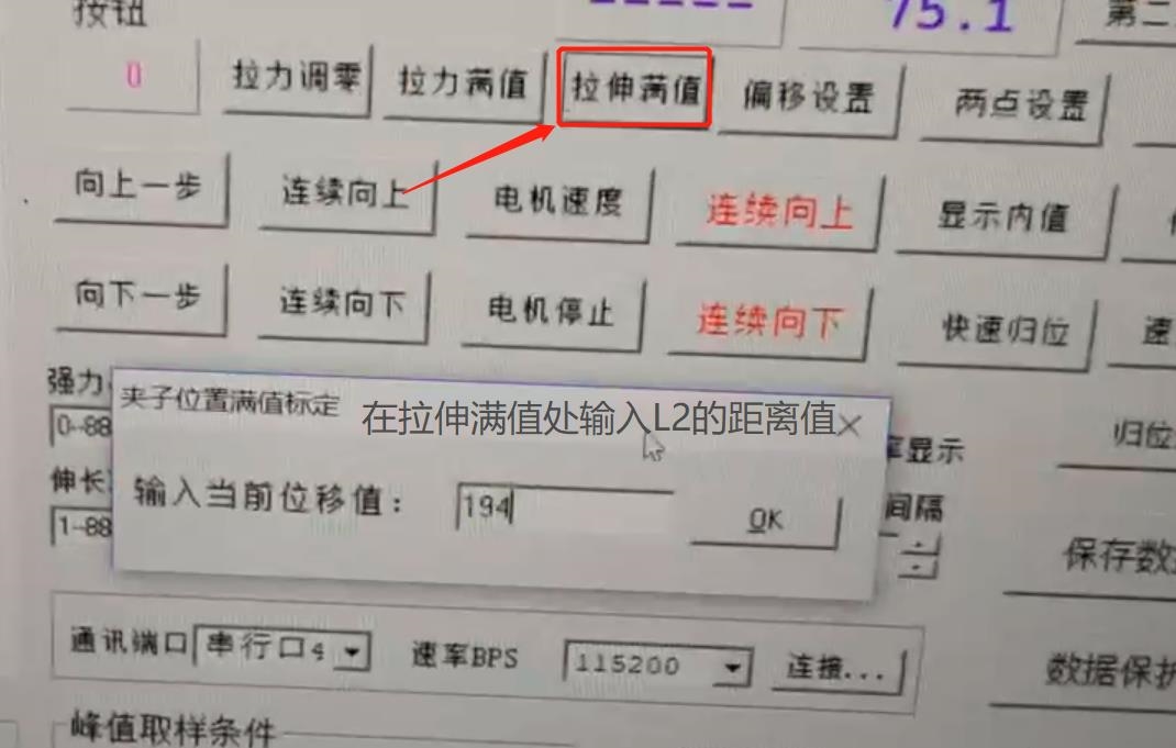 第四步:点击连续向下,当下夹具走到机器整个行程的三分之二距离时点击电机停止(注意不要让机器走的不要太下,不要碰到下限位保护装置),这时候用尺量一下上下夹具的距离记为L2,点击拉伸满值,输入L2的位移值,点击OK确认。