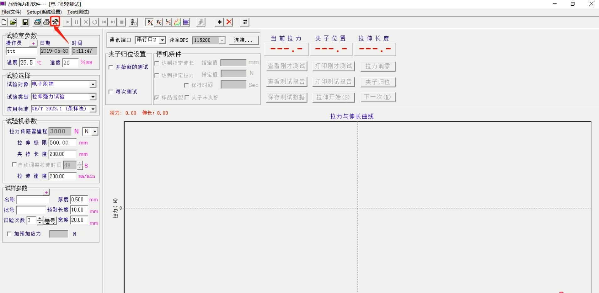 第一步:打开对应的强力机软件,连接好设备后软件下方提示连接成功后点击夹子归为按钮,用尺量上下夹具的距离记录为L1,然后点击系统设置图标如下图: