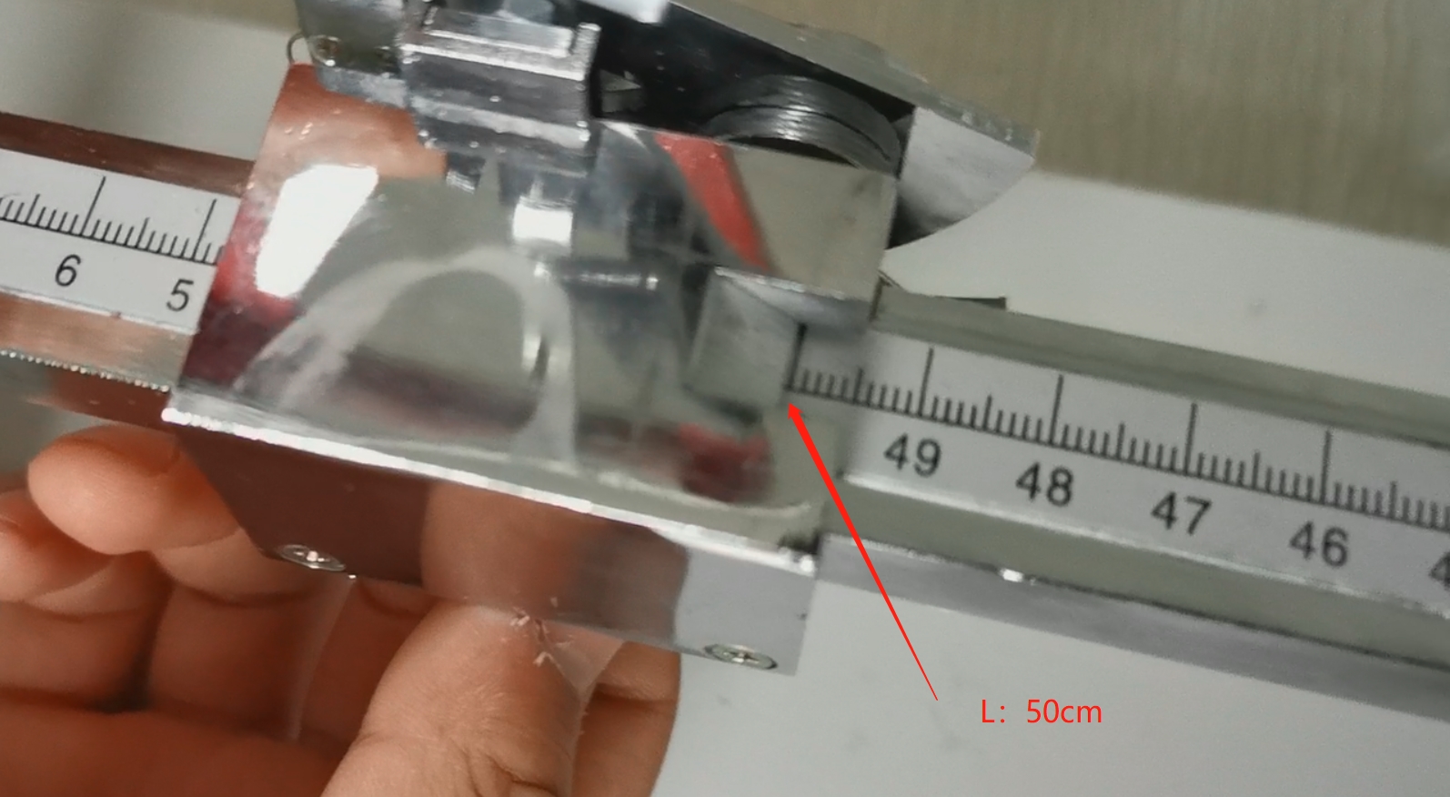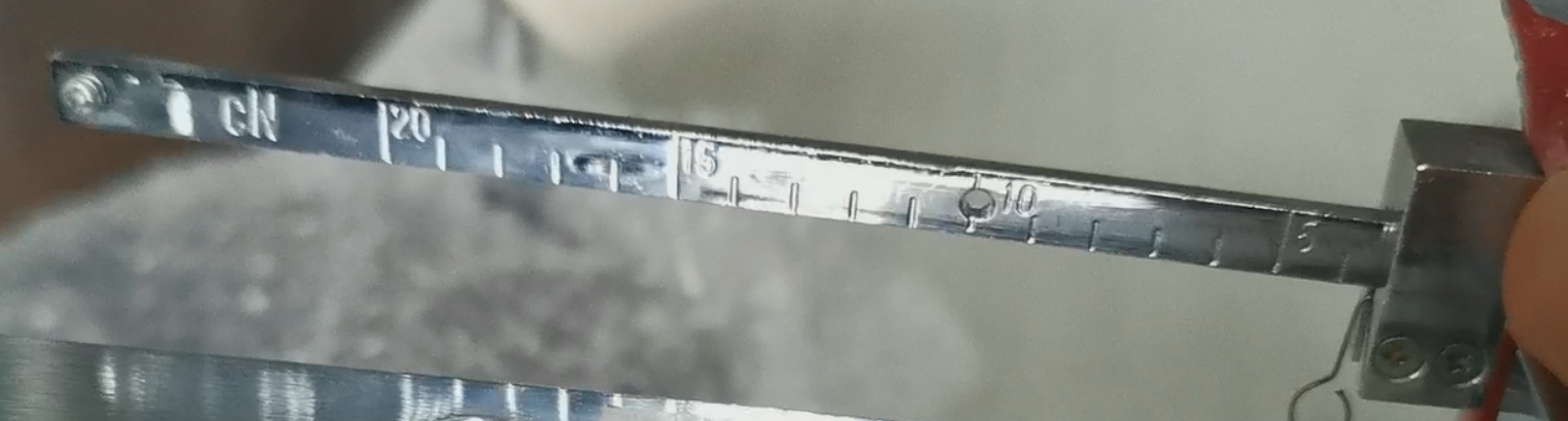 步骤四:张力秤上施加张力,预加张力施加范围是(0.5±0.1)cN/tex,如纱线为10tex,则纱线施加的预加张力为5cn,图中滑块从右往左滑,看滑块右边槽刻度,如果施加预加张力大于20cn,拿出秤盘,钩在张力秤下方,在秤盘上挂砝码继续施加张力。
