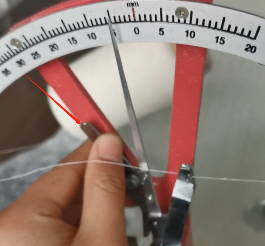 步骤五:将纱线引入到电子纱线捻度仪左右夹钳中,根据标准,一般纱线的允许伸长设置为4mm-5mm,调节固定标尺指针的装置,将标尺指针偏向0左边4mm-5mm。