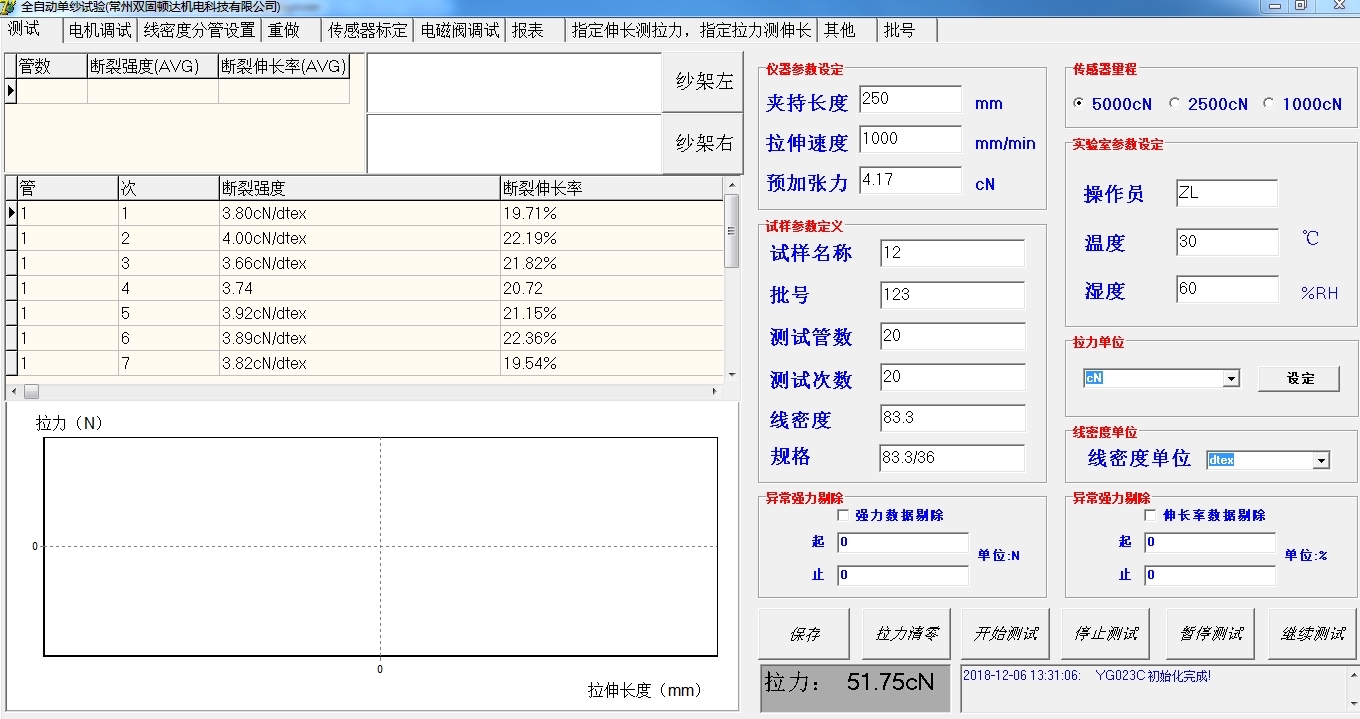 4、预加张力采用自动加载,由试样线密度(纤度)与预加张力系数乘积数而定。