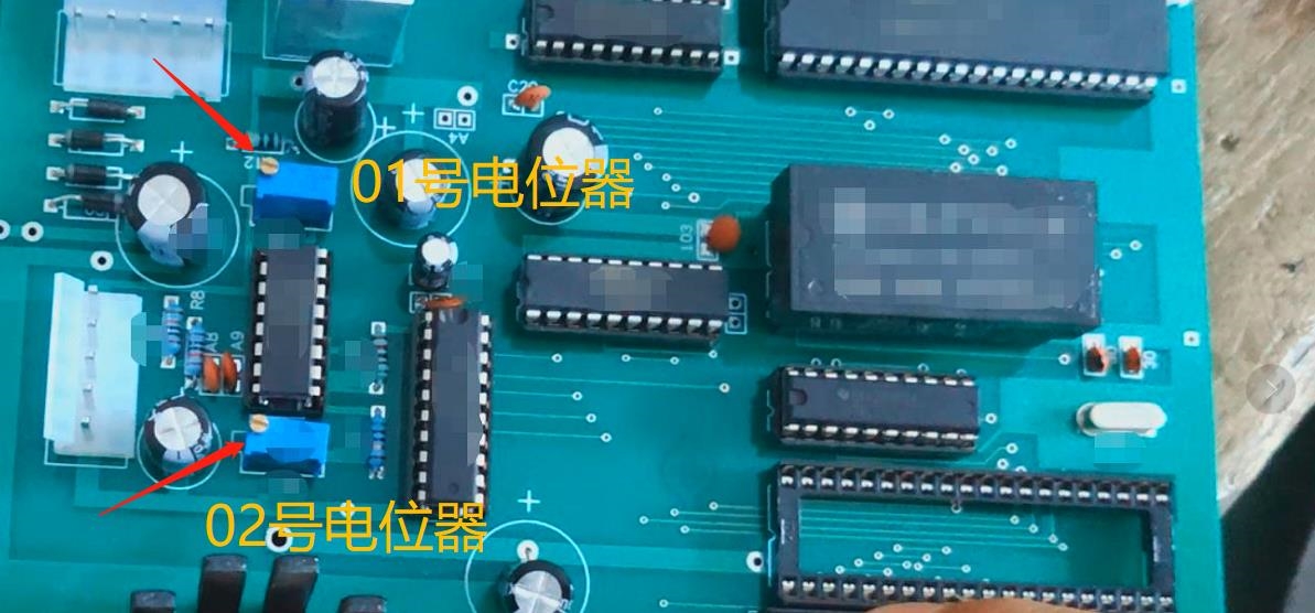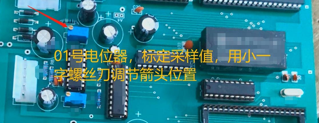 第四步:观察中间数字是不是0060左右,如果不是,需要进行校准。如果没有数字显示,而只是显示:0000,则可以用小的一字螺丝刀调节一下线路板上1号电位器(如下图),顺时针或逆时针都可以调节的,直到调出液晶屏幕上出现**************************0060*********************这样的字符,调好后再按一下“标定“键,“去皮键”,关电源,到此采样值标定结束,下面进行强力校准。