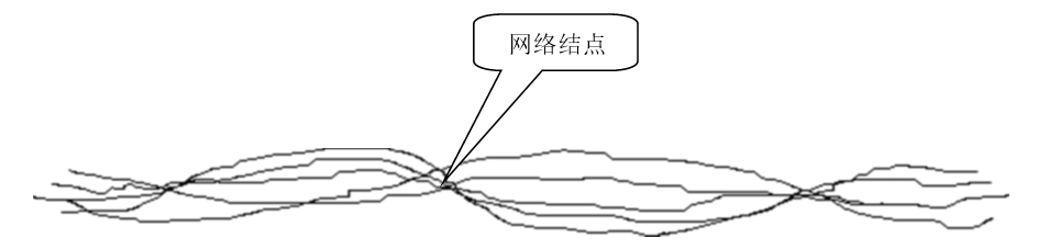 上图是网络丝示意图,它由多根单丝粘合组成。利用压缩空气喷嘴(网络器)对长丝进行喷气吹络,行成互相缠结周期性的长丝。
