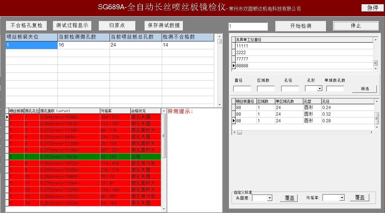 1.孔直径、孔面积,圆度,污垢率,微孔合格情况等数据,测试数据在合格范围的喷丝孔显示“绿色”,不合格的显示“红色”。对微孔的合格品质进行判断,判断微孔是否合格,微孔面积是否过大或过小,所检测的微孔状态是否符合设定的范围,并有红色或绿色标注。