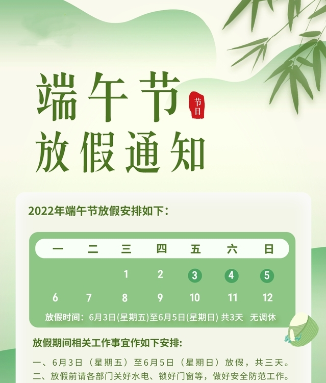 一、放假时间:2022年6月3日至6月5日共3天。
