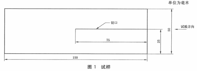 试样尺寸150mm*50mm,剪裁的试样需要边缘平滑无缺口,可用低倍放大镜检查缺口,舍去边缘有缺陷的试样沿试样长轴方向切缝至1/2处(如下图所示)在测试过程中,撕裂不成直线而使裂口偏到试样另一端时,此试样应舍弃并另取试样重新测试。,