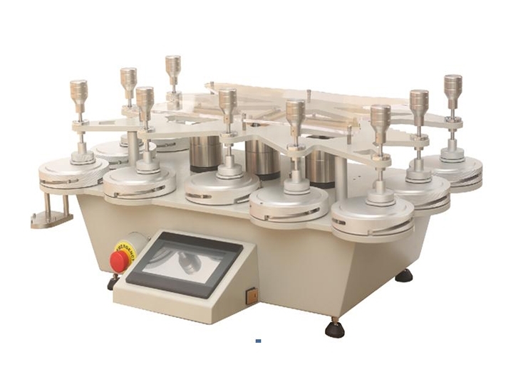 1、将圆形试样置于磨头上,在规定的压力下,与固定在磨台上的标准毛织物磨料作平面接触,按李莎茹(LISSAJOUS)运动轨迹(二个相互垂直的谐振运动合成的轨迹)进行多方向性的平移摩擦,直到试样磨至规定次数,仪器自动停止运行。本机有大小李莎茹二个运动轨迹功能。