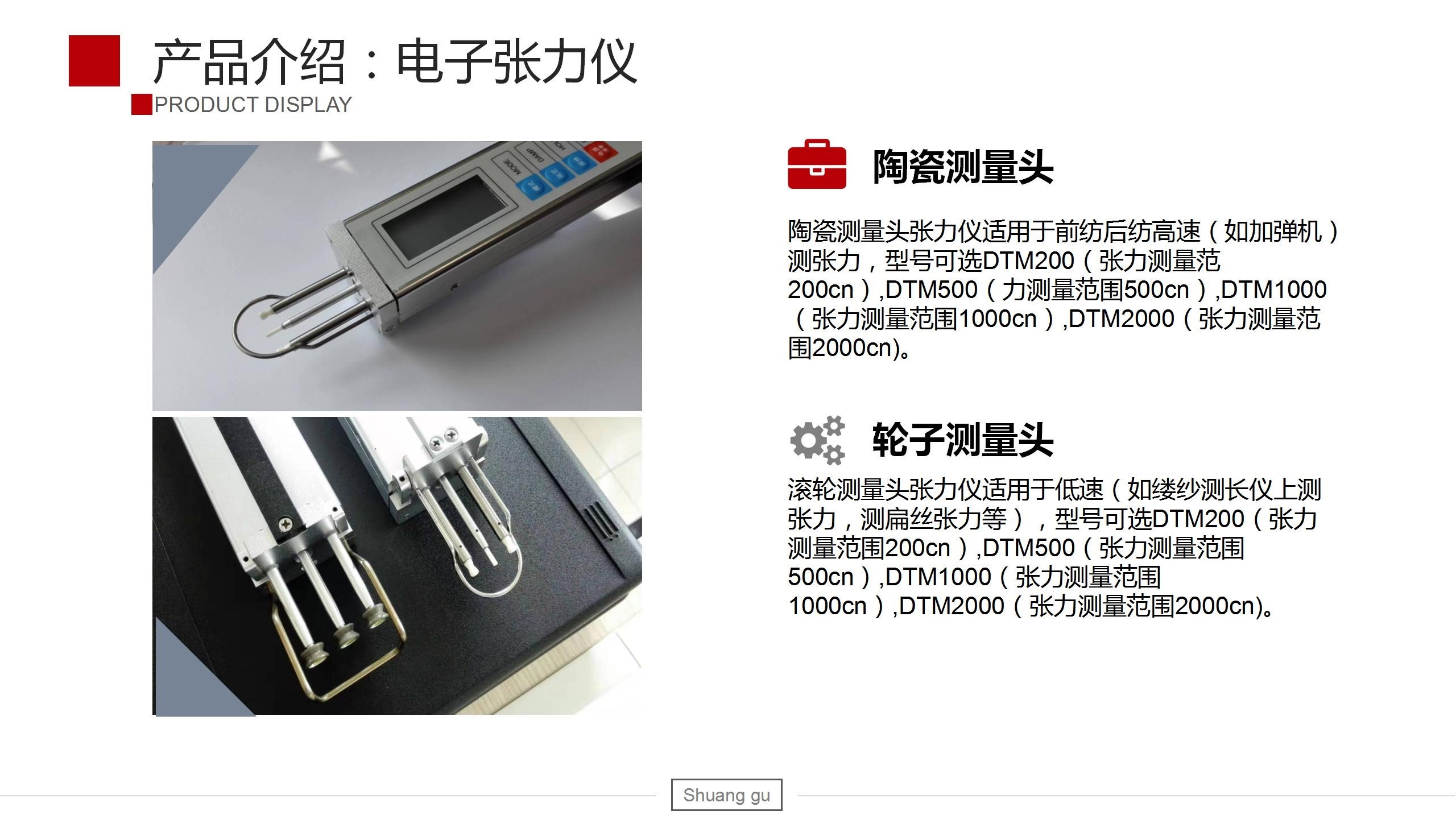 DTM200型纱线张力仪用于各种毛、麻、丝、化纤及金属拉丝、玻璃纤维和光导纤维等产品的静、动态张力检测,为提高纱线质量和产品服用性能提供可靠的依据。