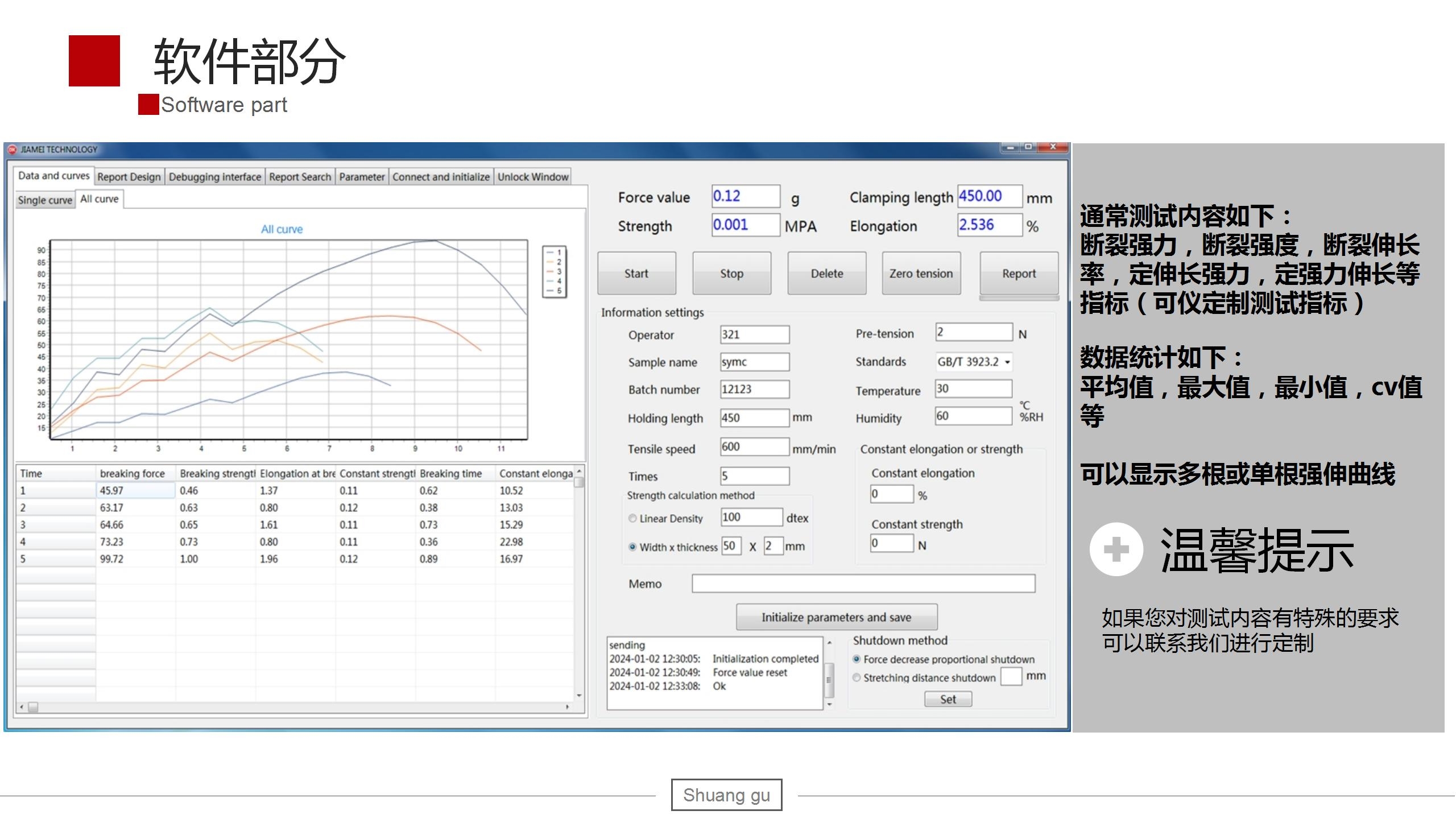 8、打印:断裂强力,断裂强度,断裂伸长,断裂伸长率,断裂时间各种形式数据,曲线及统计结果