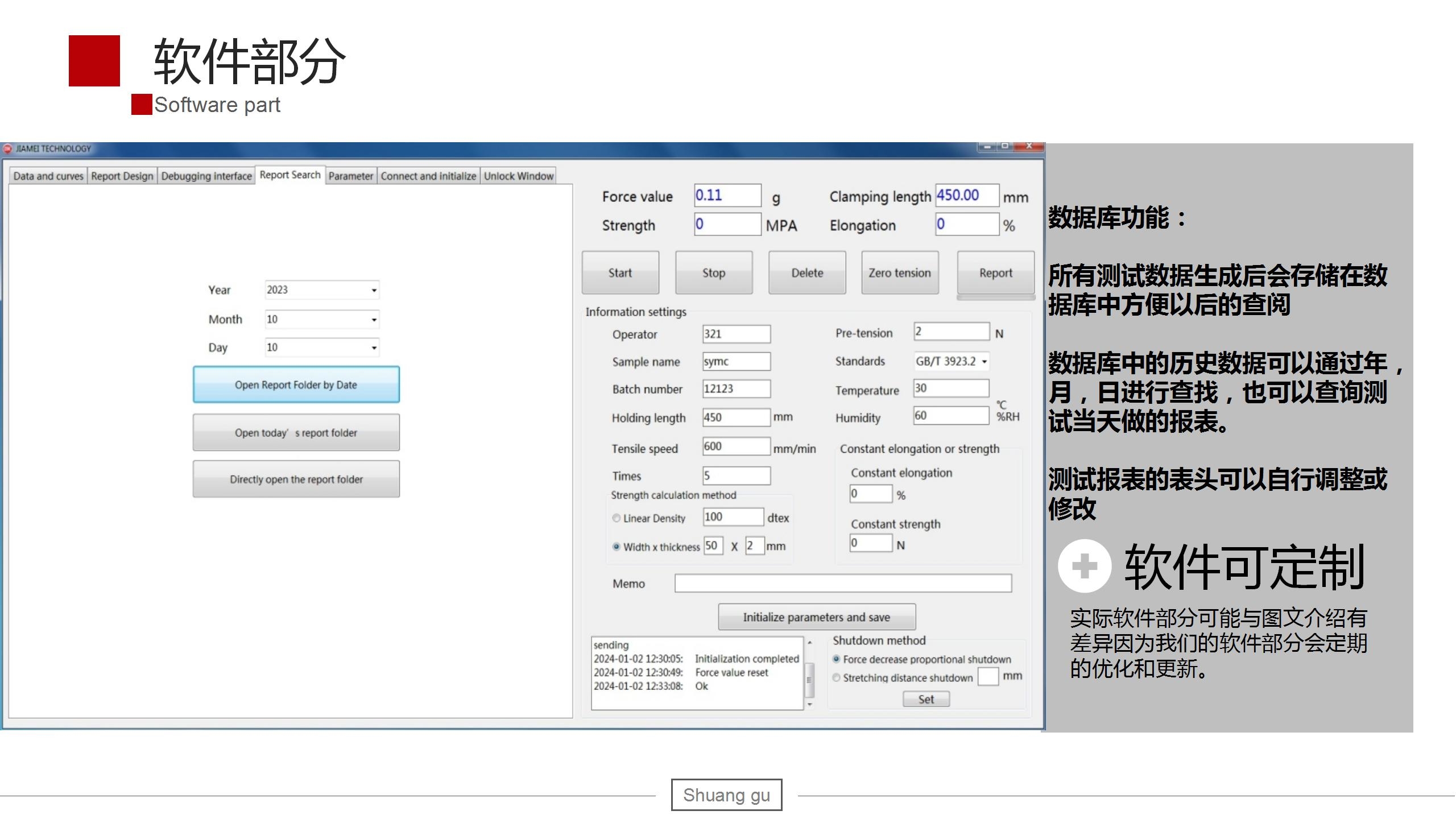 8、操作特点:操作简便,可以自定义设置试样名称,批号,试验次数,操作员姓名等信息。