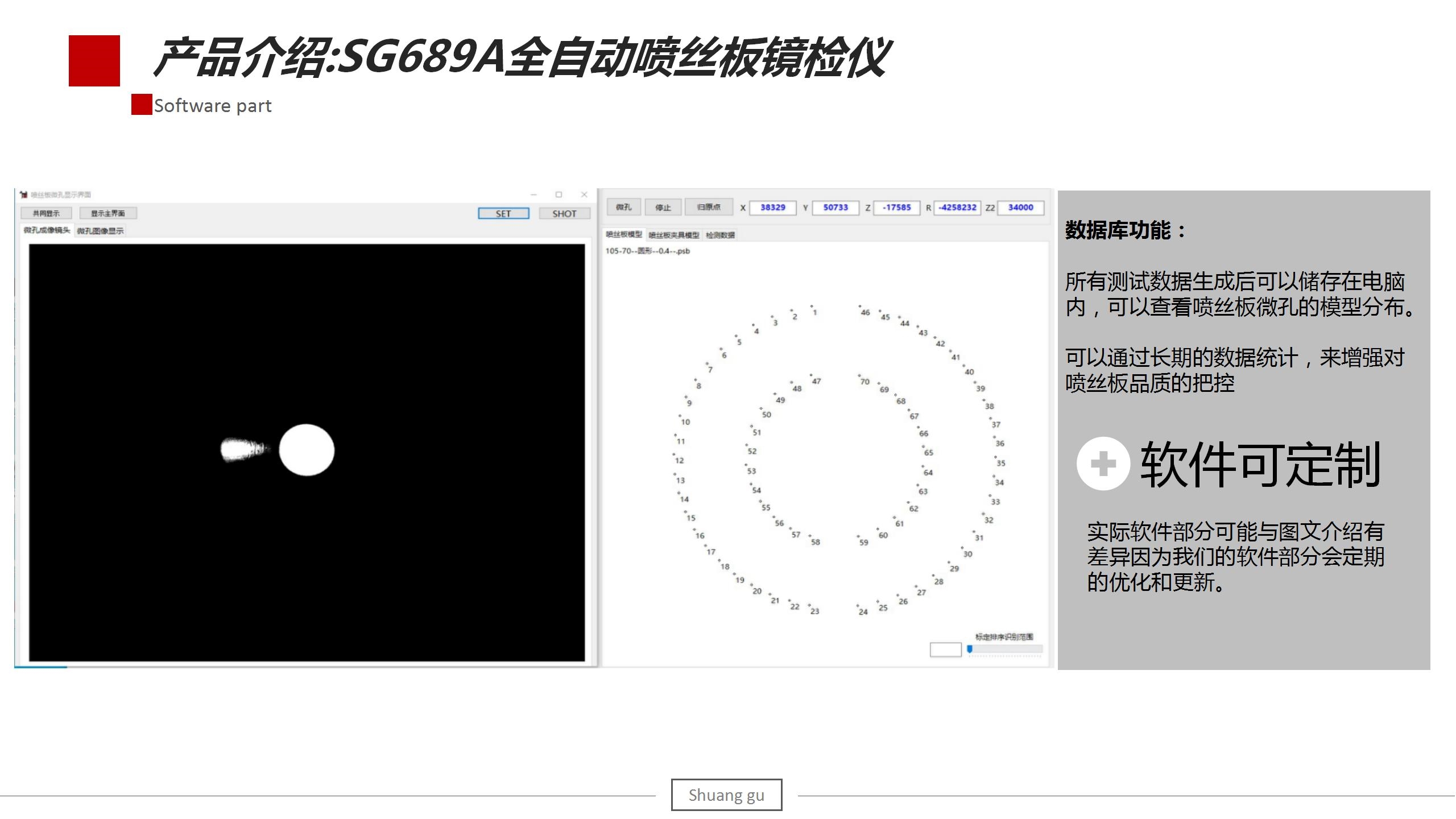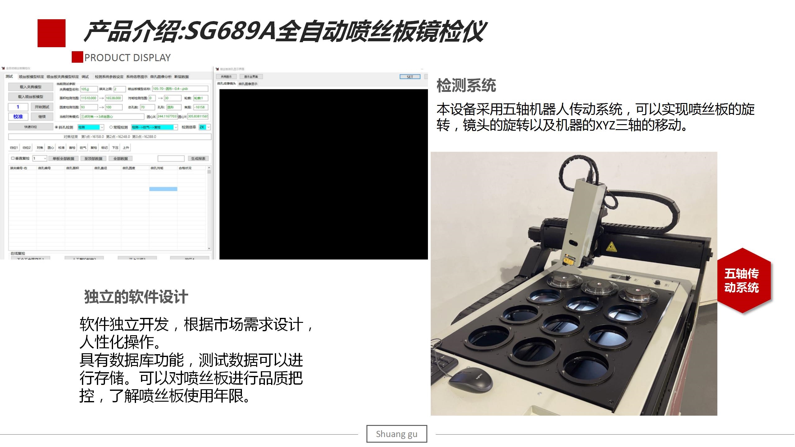 SG689A型全自动喷丝板镜检仪(测双斜孔)用于检测各类斜孔喷丝板的纺孔尺寸大小及是否堵塞的专用仪器。化纤丝的类型主要有双组份并列复合纤维,GPN高收缩涤锦复合纤维等复合纤维等,此检测系统可以检测斜孔板/常规板微孔的直径、面积、圆度、污垢率及微孔合格情况,还可定制纺孔内壁断层扫描功能。除此之外,我们也可以根据实际情况满足客户关于特殊异形孔板的检测。