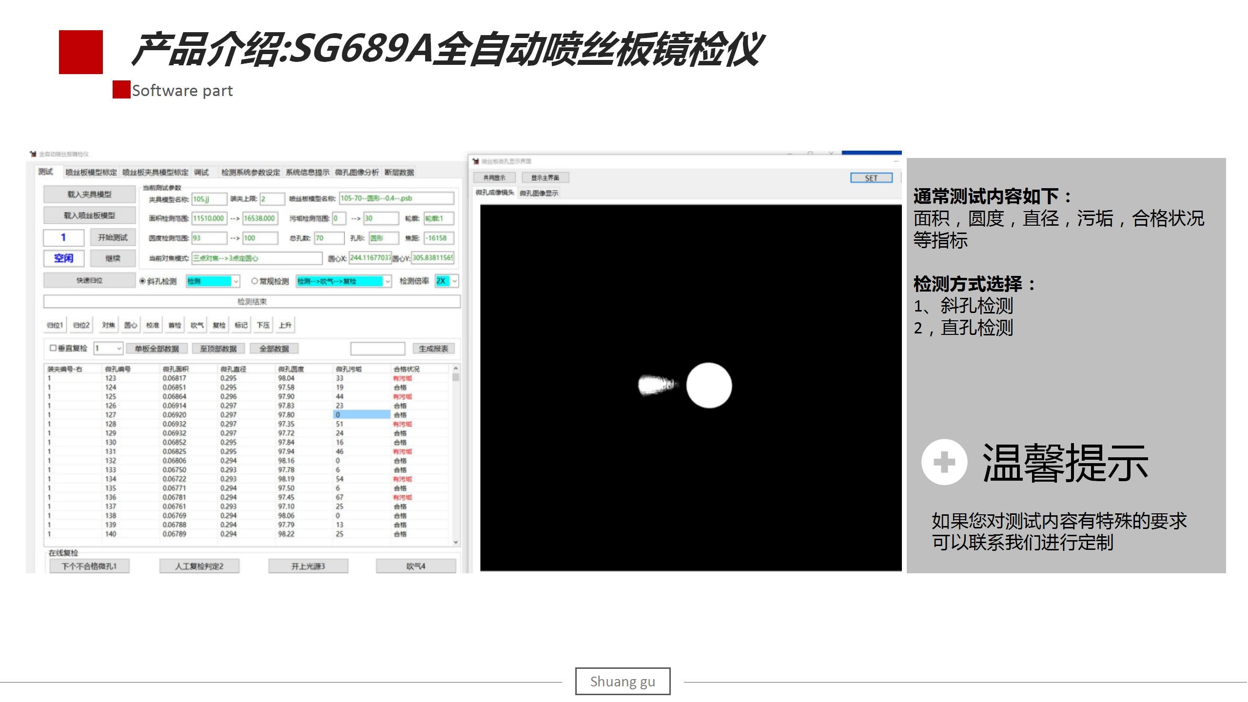 【检测项目】1.微孔直径、面积、圆度、污垢率、微孔合格情况,特殊异形孔尺寸等数据,用户可以在程序上自行设定判断标准,判断微孔是否合格,微孔面积是否过大或过小,所检测的微孔状态是否符合设定的范围,检测出的不合格数据程序上会用不同的颜色标注出来。