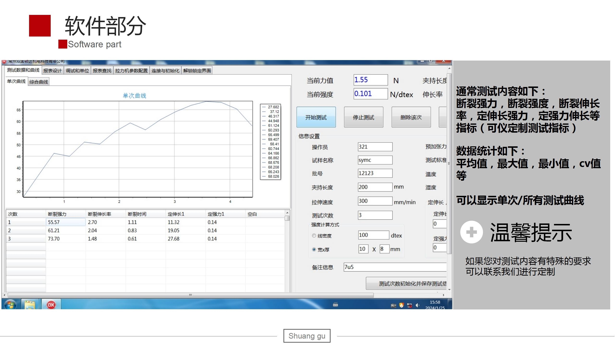 1、测试方式:等速伸长(CRE)原理测定,计算机控制,并记录曲线动态变化及断裂强力、断裂伸长(伸长率)、时间、次数等。